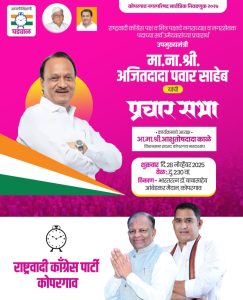 कोपरगाव नगरपरिषद निवडणुकीच्या राष्ट्रवादी काँग्रेसच्या नगराध्यक्ष व नगरसेवकांच्या प्रचारार्थ शुक्रवार (दि.२८) रोजी दुपारी २.३० वाजता राज्याचे उपमुख्यमंत्री तथा अर्थमंत्री ना.अजीतदादा पवार यांची जाहीर सभा भारतरत्न डॉ.बाबासाहेब आंबेडकर मैदान कोपरगाव येथे माजी आमदार अशोकराव काळे यांच्या अध्यक्षतेखाली व आ.आशुतोष काळे यांच्या प्रमुख उपस्थित होणार आहे अशी माहिती राष्ट्रवादी कॉंग्रेस पक्षाचे शहराध्यक्ष सुनील गंगूले यांनी दिली आहे.